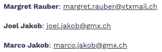 | Salate | Kichererbsensalat (Margret) Gurkensalat (Joel) Tomatensalat (Urs) Rüeblisalat (Isabel & Marco) [...] |
